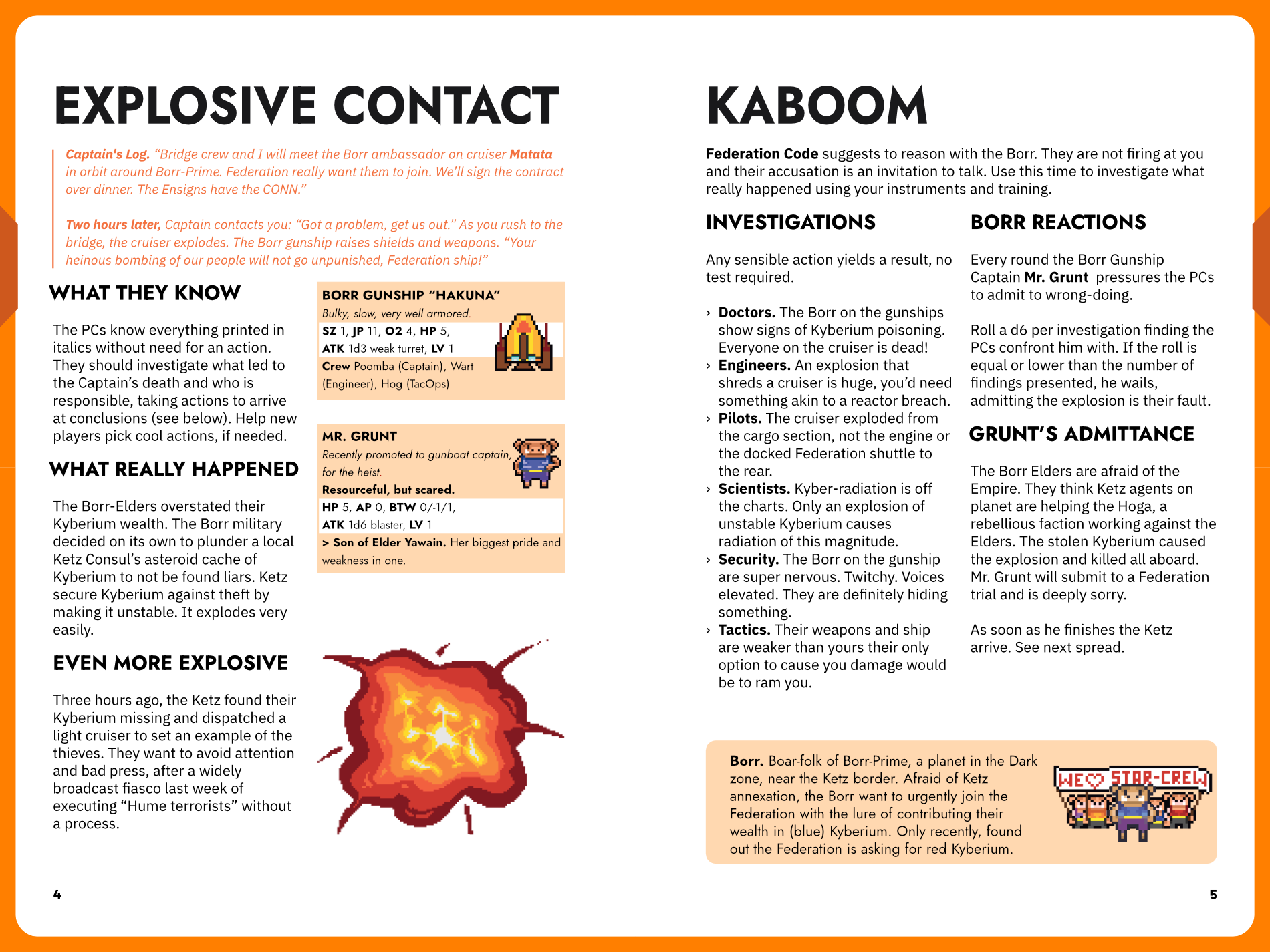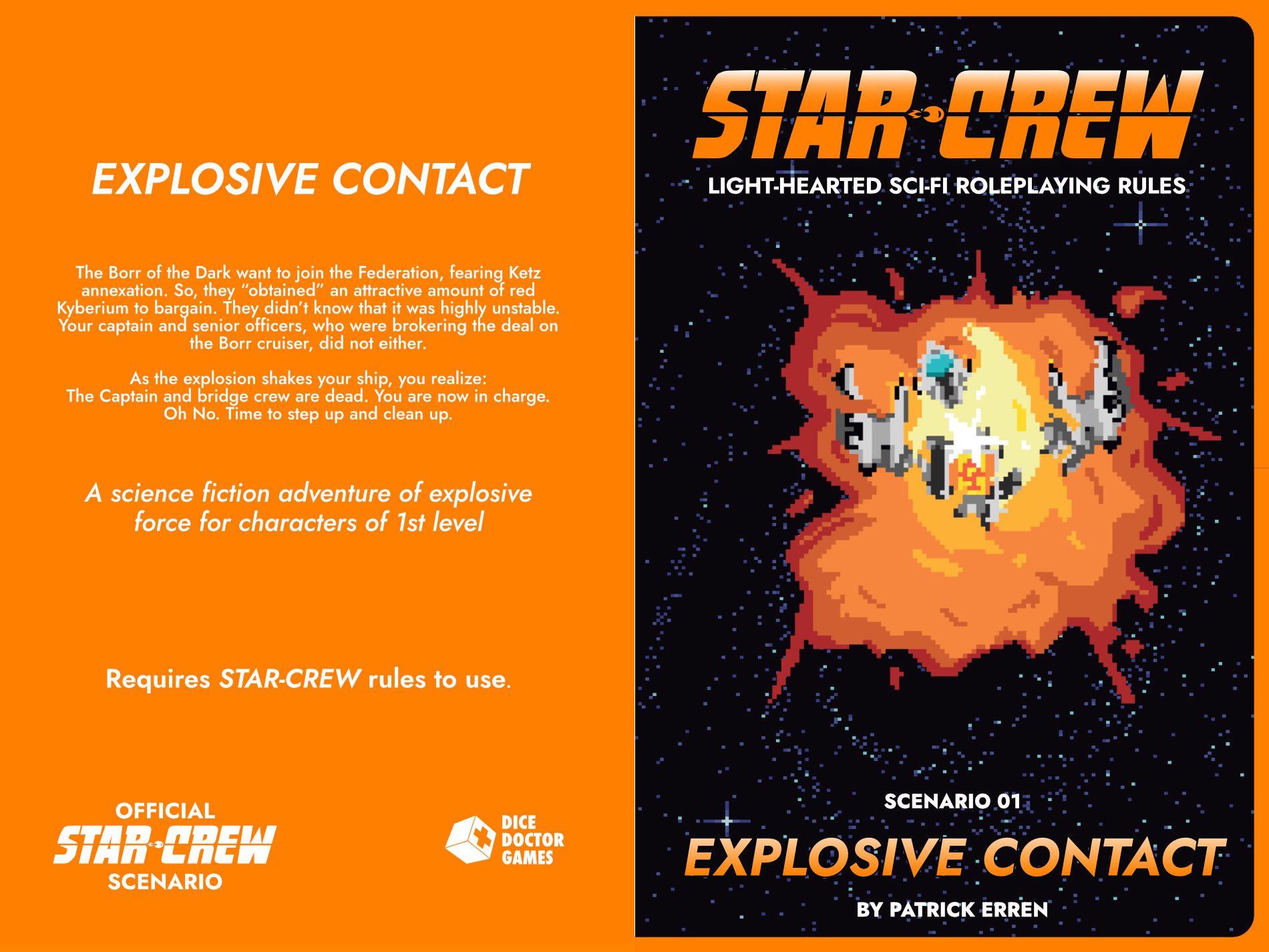 Explosive Contact is a twenty page Starter Scenario for Star-Crew RPG, a light-hearted space ventures roleplaying game.